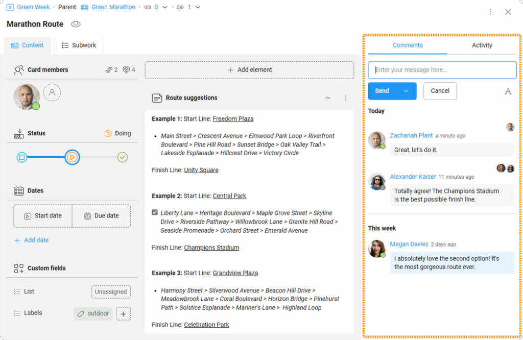 Messages in cards are a great way to collaborate with other KanBo users. They’re perfect for short conversations about card content. Use them to let your colleagues know about the latest news or ask for help.