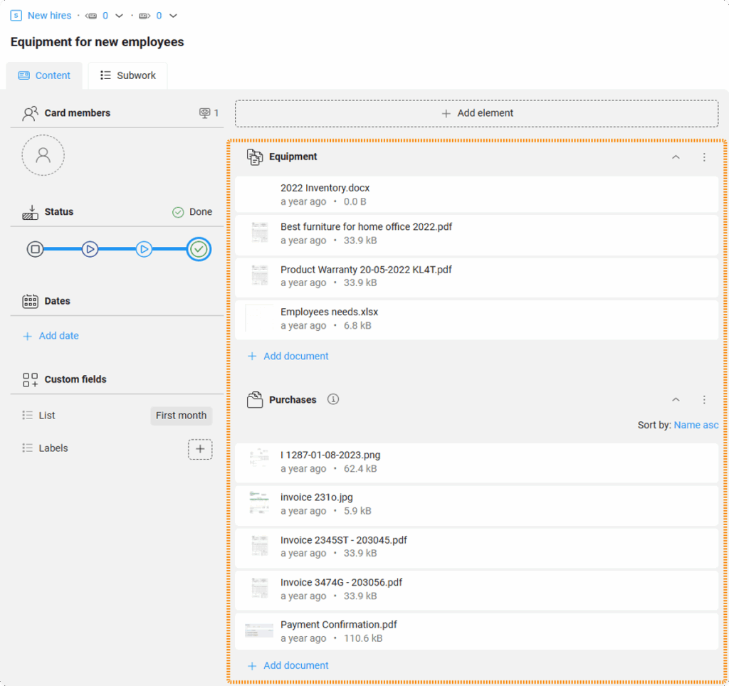 Documents are an integral part of work. Therefore, you can take them with you into the KanBo world. Add documents to cards and share them with other users. Edit existing files or create new ones.