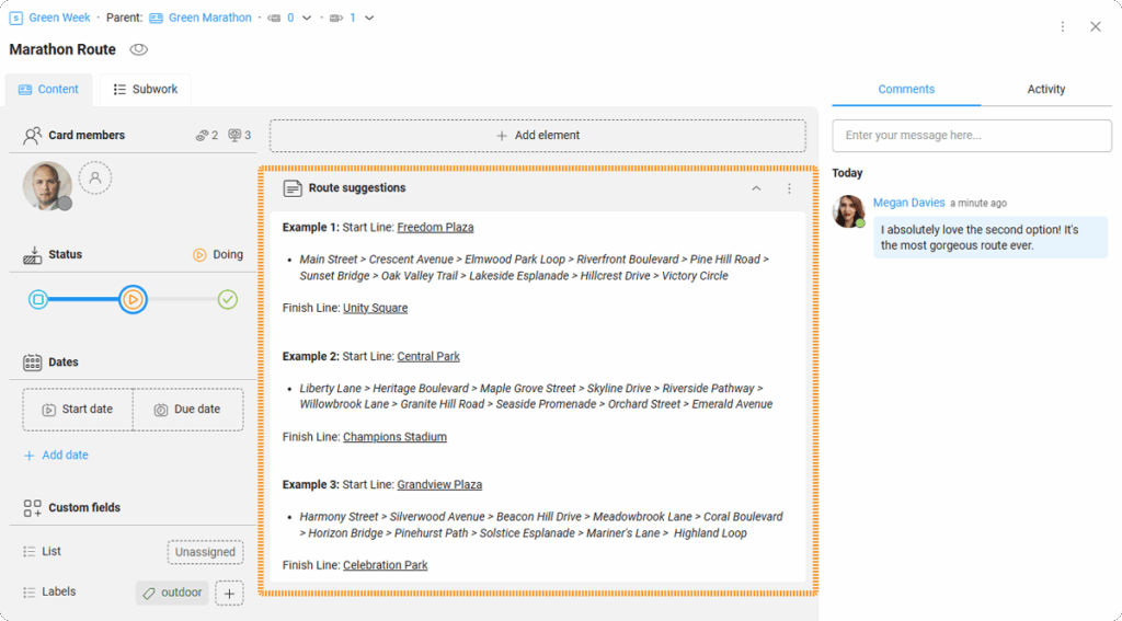 Messages in cards are a great way to collaborate with other KanBo users. They’re perfect for short conversations about card content. Use them to let your colleagues know about the latest news or ask for help.