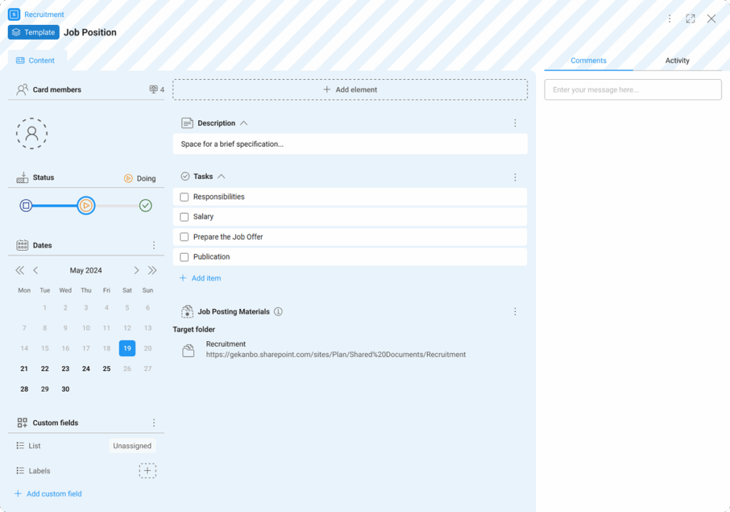 Cards are the most fundamental units of KanBo and contain information created with notes, files, comments, dates, checklists, and other data relevant to the task at hand. Their extensive structure will allow you to adapt them to any situation.